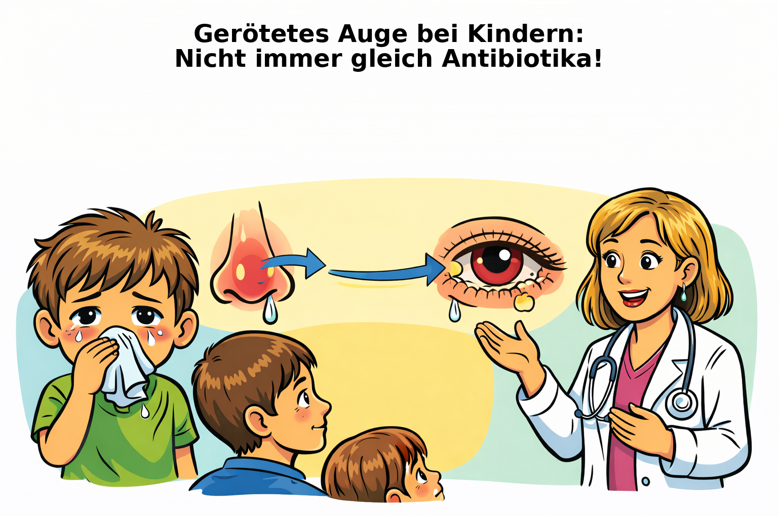 Das gerötete Auge bei Kindern hat viele Ursachen. Häufig steckt eine Erkältung mit Sekretrückstau dahinter – nicht eine bakterielle Infektion. Ein zurückhaltender Umgang mit antibiotischen Augentropfen schützt Ihr Kind, unterstützt ein gesundes Mikrobiom und hilft, Resistenzen zu vermeiden.